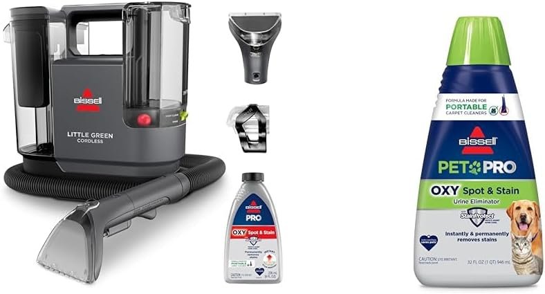 BISSELL Little Green Cordless SmartMix, Powerful Cordless Suction, HydroRinse Self-Cleaning Hose Tool + BISSELL® PET PRO OXY Spot & Stain Formula for Portable Carpet Cleaners, 32 oz.