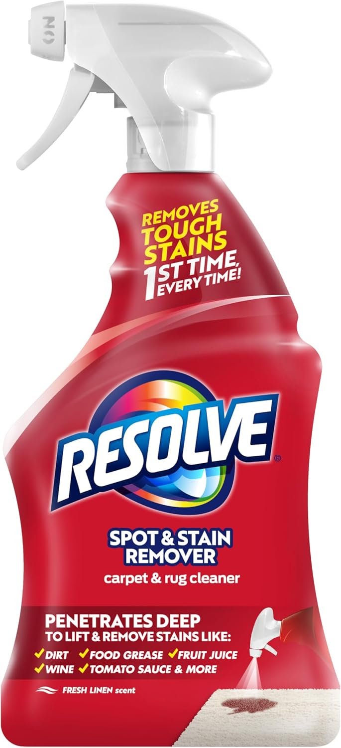 Resolve Carpet Spot & Stain Remover is specially formulated to penetrate deep, break down and lift out all types of tough stains & odors from carpets and rugs. It permanently removes the toughest and set-in stains for newer looking carpet. Resolve Spot & Stain is the #1 carpet stain remover*. It helps keep stains from reappearing, works on a wide variety of everyday stains, and leaves your carpet soft & fresh smelling. This product works on: tomato sauce, salad dressing, dirty motor oil, vegetable oil, make-up, red wine, food grease, pet stains, coffee, mud, dirt, cola, tea, grass, fruit juice & more!